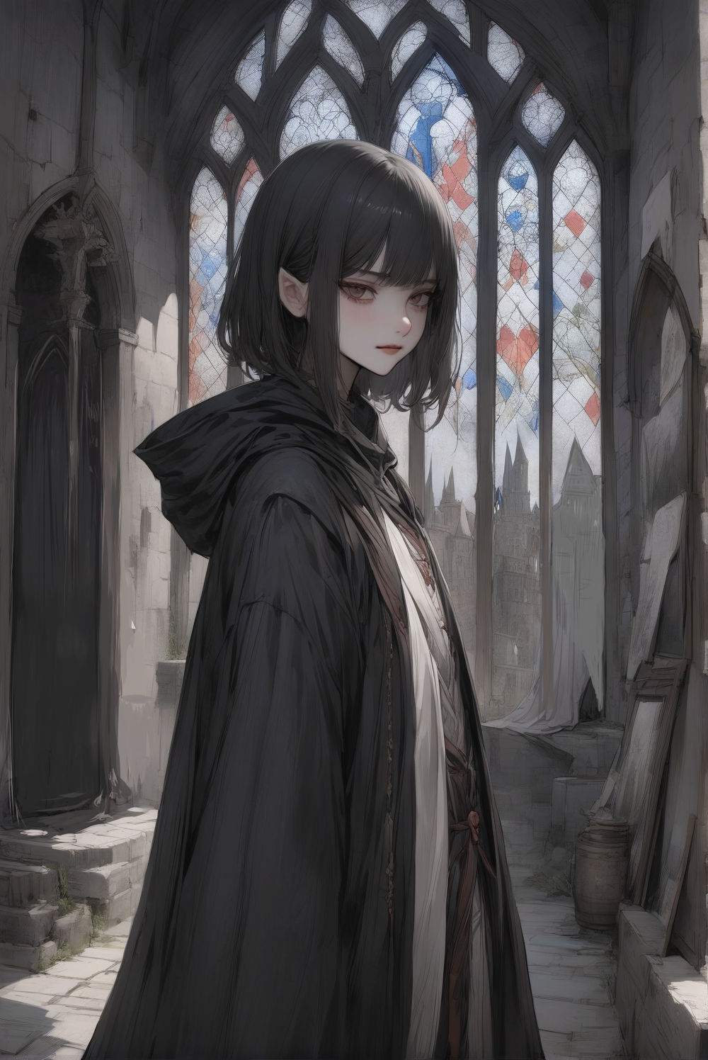 【容姿】 白皙の肌、深いぬばたまの切れ長の瞳と、同色の髪はショートボブに。薄い唇。八重歯あり。耳は若干尖り気味。もとより中性的な顔立ちなうえ、外套にて身体の線を隠しがちなため、第一印象は「少年」のようでもあり。けれどよくよく見れば、睫毛の長さや印象の儚さ、線の細さ等から「少女」だと判ずる者も。