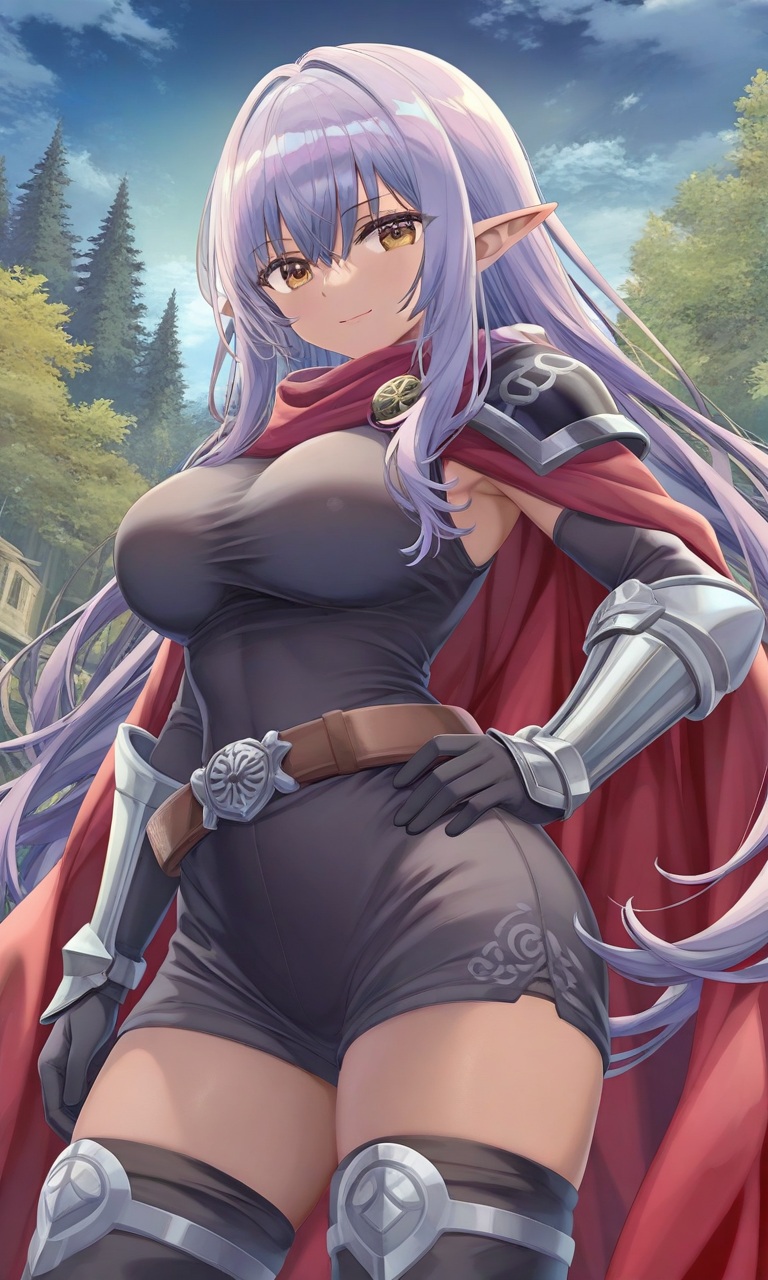 外見:艶やかな長い薄紫色の髪、鋭く見える琥珀色の瞳、整った顔立ち、尖った耳 筋肉質ながらも女性らしい曲線を保つアスレチックな体型。 腕と脚には鍛えられた筋肉が浮き彫りで、特に太ももは力強さと柔軟性を兼ね備える。 胸部は豊満で、ウエストは細く引き締まり、ヒップは適度に丸みを帯びた形状。 全体的にバランスが良いスタイル。 服装:黒くタイトで上下一体型のボディスーツのような衣装。 袖やズボン部を切り詰めて動きを阻害しないようにし、それでいて使っている布地で防御力と動きやすさを兼ね備えた軽装。 肩、腕、脛など最低限の部分に金属製の鎧部位を装着し、腰には太めのベルト、手袋、ハイサイソックスを着用、足元はブーツ。