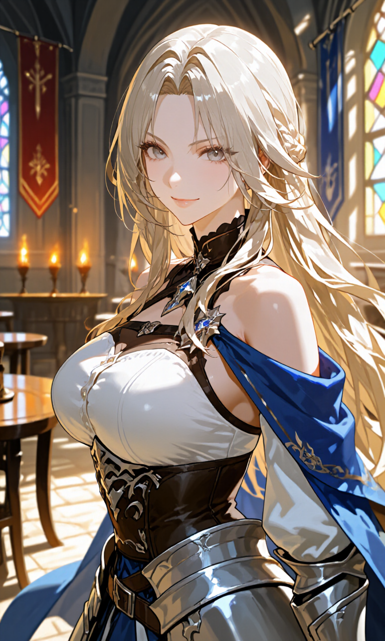 【外見・服装】 プラチナブロンドを胸の辺りまで伸ばす。雪のようにきめ細かな白い肌。 顔立ちは整っているがやや幼さが残る。通った鼻筋、唇はやや厚め。 出陣する際は濃グレーのプレートアーマーに身を包む。 普段着は比較的ラフで動きやすいものを好み、それ故メリハリのついた体格が目立ちやすい。 細身の長剣、ダガーにも似た短剣をそれぞれ腰に携える。