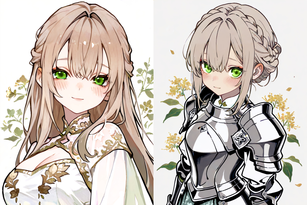 腰辺りまでのロングヘアー。艶のある亜麻色の髪。 透明感のある若草色の瞳。ややタレ目。 瑞々しく、透明感のある白肌。 柔和そうな顔立ち。
