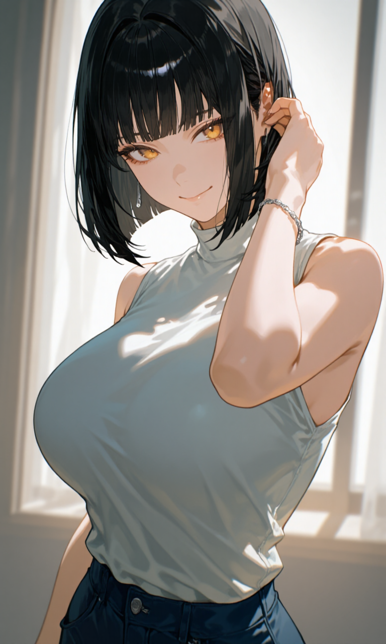 【容姿】 身長167cm B93W59H88 黒髪のショートボブ、亜麻色の瞳は切れ長の二重 豊満な体躯を身軽な軽装に押し込めている 白い肌 筋肉質でしなやかさの目立つスタイル だが健康的というより、妖艶さを醸し出す雰囲気