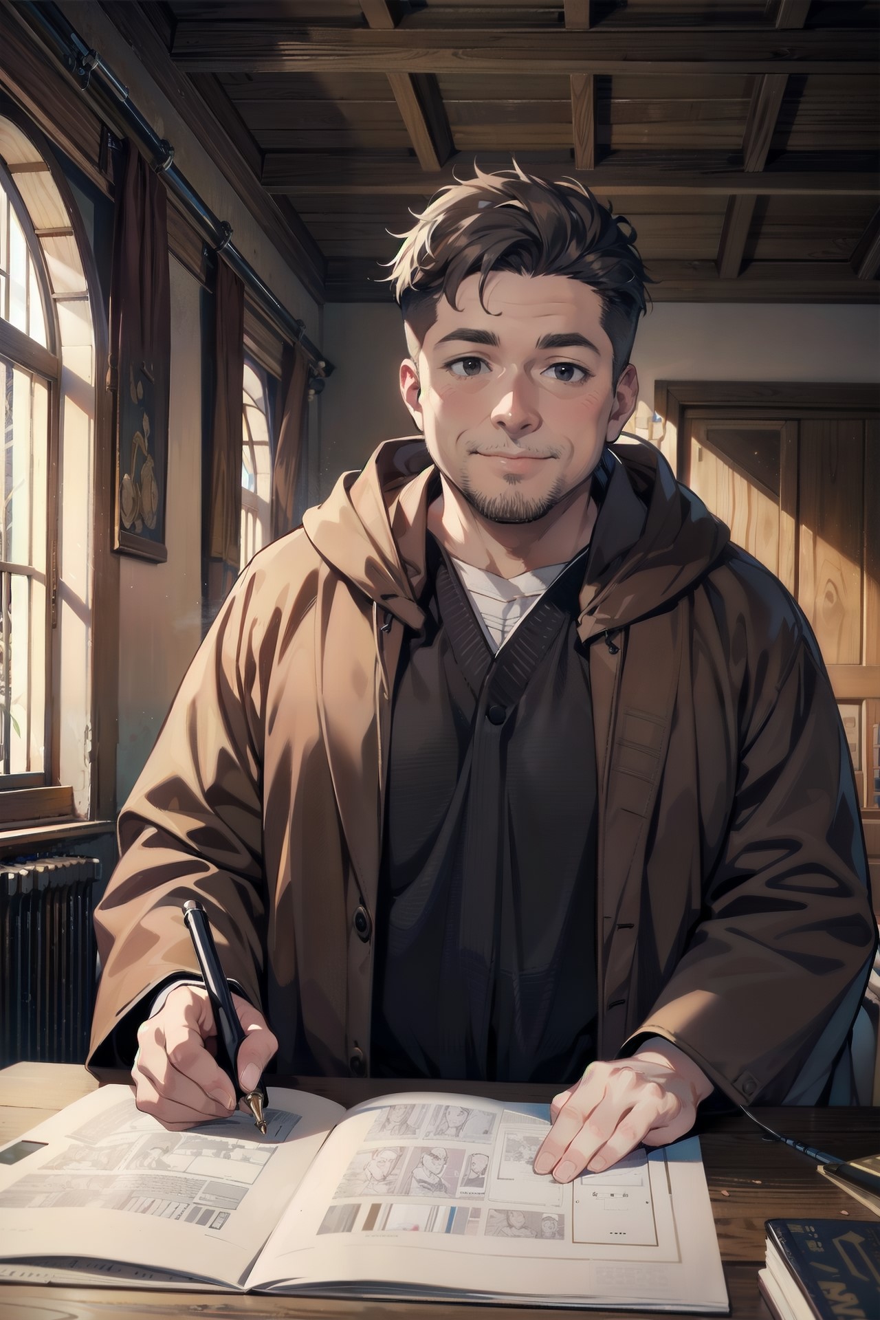 用務員としての恰好は、シャツとズボン、其の上に茶色のローブ。