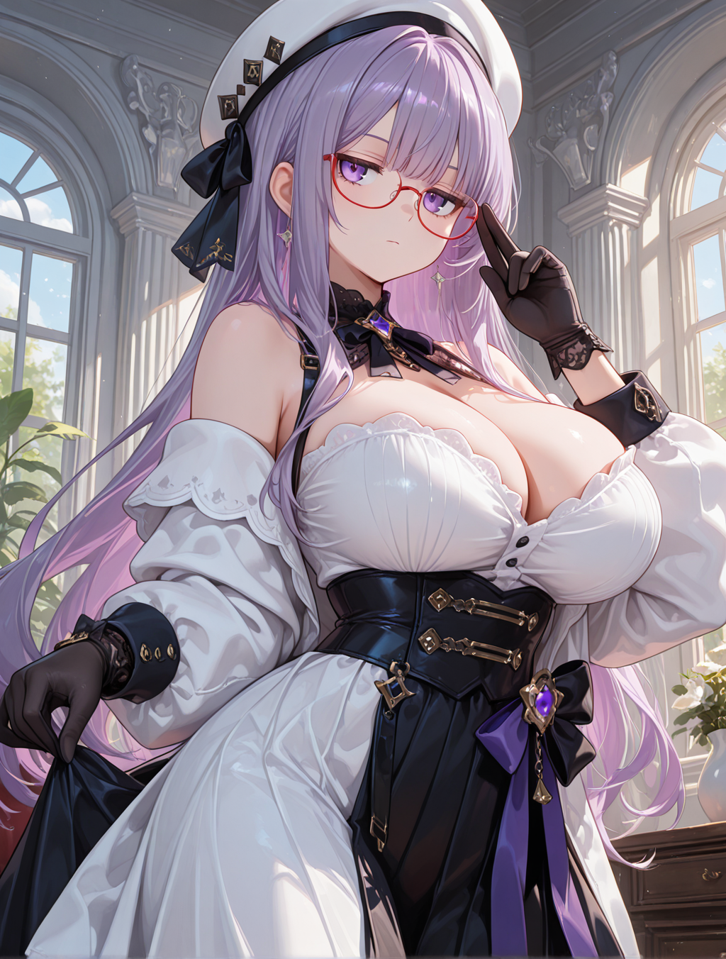 ・藤色の臀部下までのウルトラロングヘア ・瞳は薄紫 瞼は力無さげの半目 ・赤の下縁眼鏡 ・全体的に日焼け零の白め肌