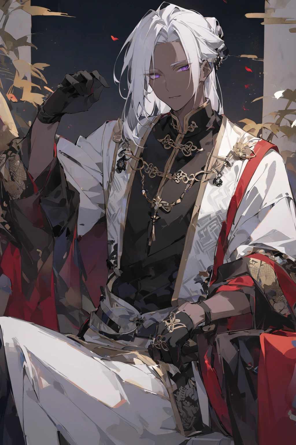 【容姿】 銀雪色の長髪。一部を頭の後ろで括っていることが多い。 似紫色の瞳。切れ長で冷たい印象を与える。 長身。筋量としなやかさの調和を感じさせる体躯。 シェンヤンの装飾を交えた衣服を纏う。