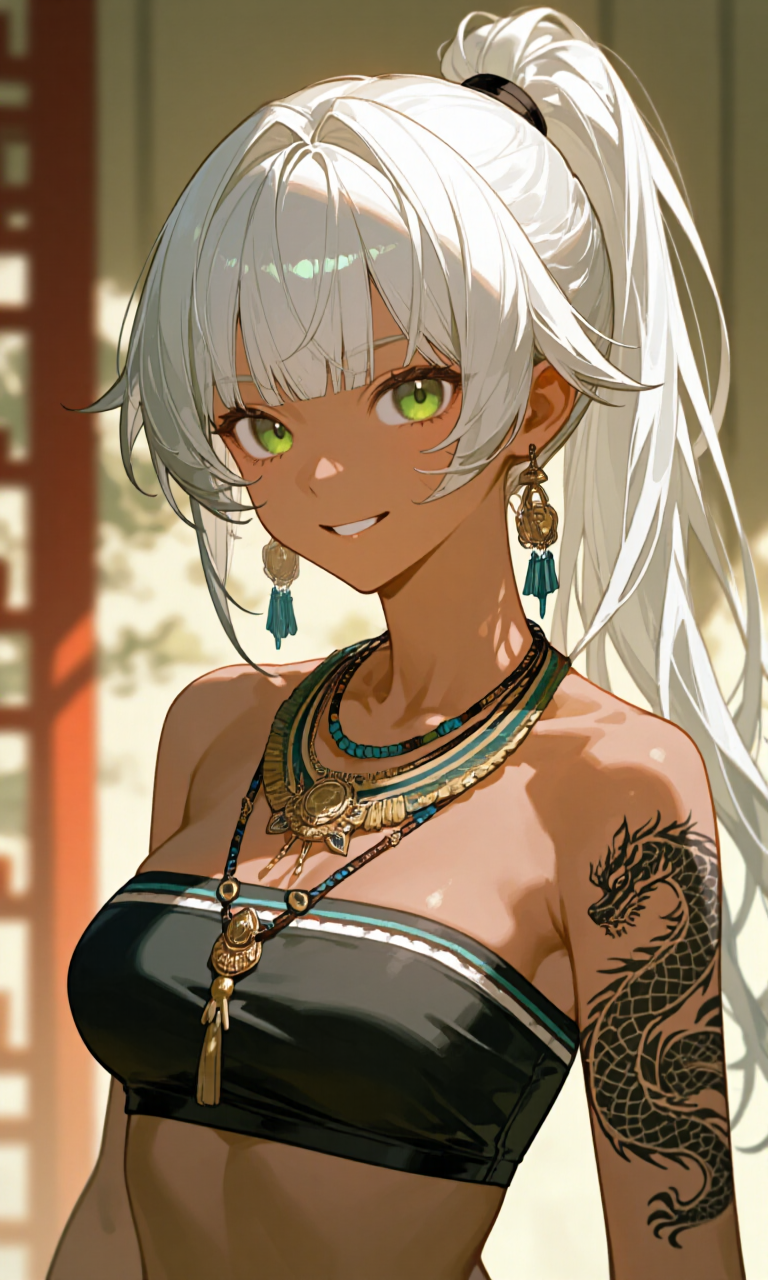 銀が多少混じった白髪を胸元辺りまで伸ばし、ポニーテールにして括った髪型。 顔面積の割合に比して大きめな双眸は深みのある翠。 褐色肌、左腕の肩口から肘辺りにかけて竜を模した刺青を入れている。 筋肉質でしなやかな体躯、遠方に伝わる民族衣装めいた格好に身を包む。胸サイズは控えめ。