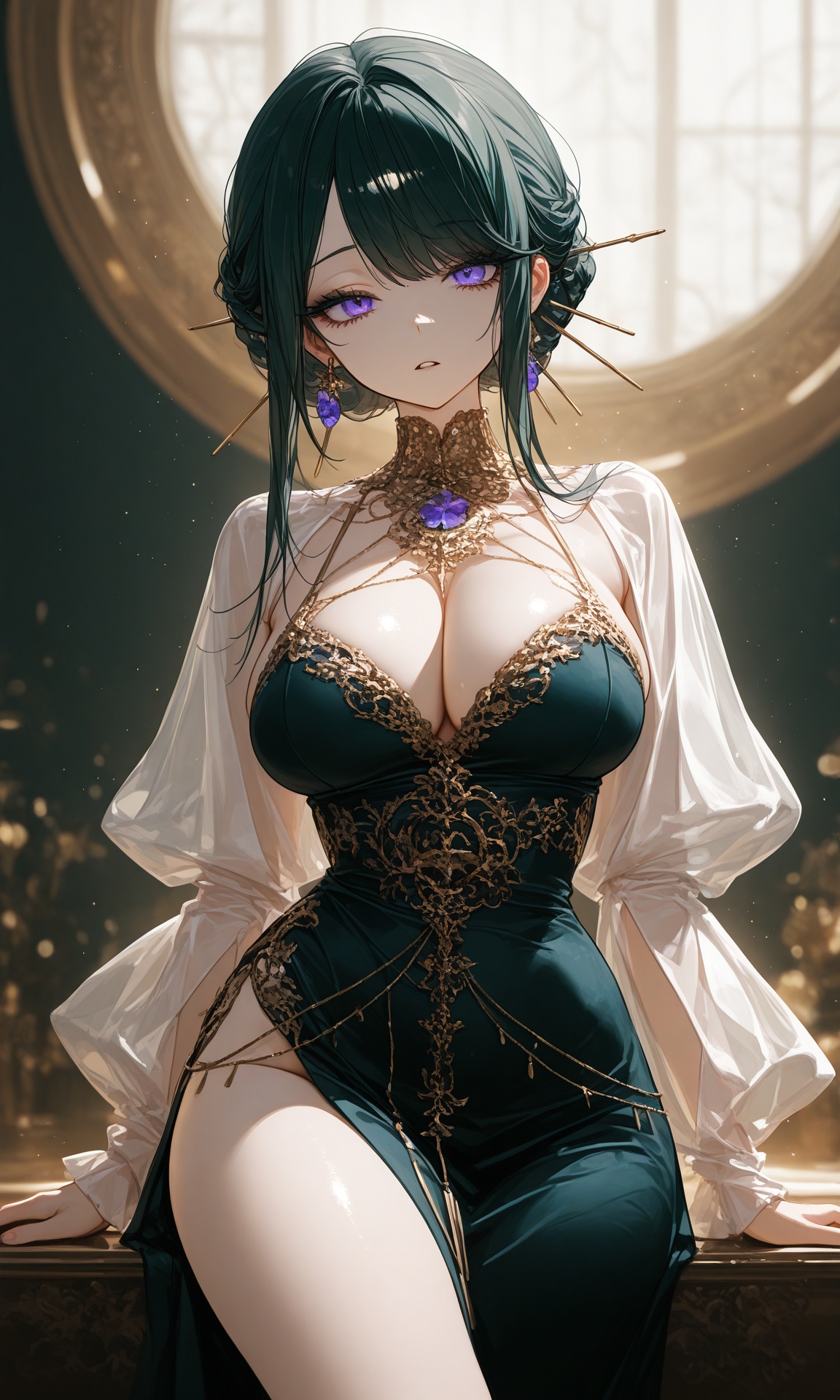 髪色/質:ダークグリーンのロングヘア。しっとりとした艶のある髪質